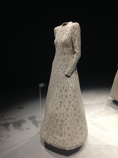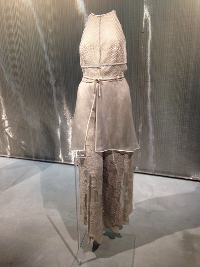 Sobreposição de tecidos transparentes, como organza e chiffon dão um ar de leveza, mistério e elegância aos vestidos expostos nesse andar.